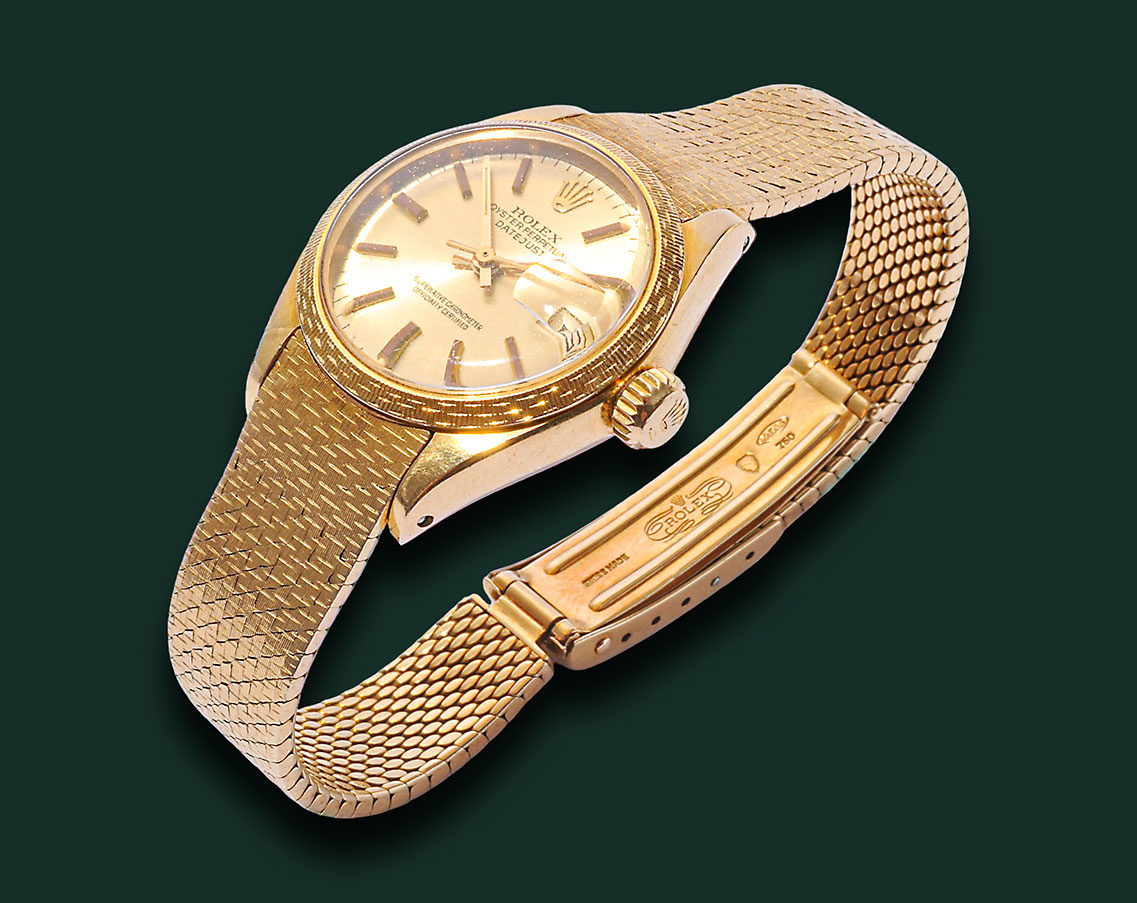 Rolex DateJust Lady, referenza 6905, anno 1973, cassa in oro 18 Kt con diametro 26mm, quadrante oro, vetro zaffiro, bracciale in oro 18kt, datario a ore 3, movimento automatico calibro Rolex 2035, orologio corredato da nostra scatola e garanzia.