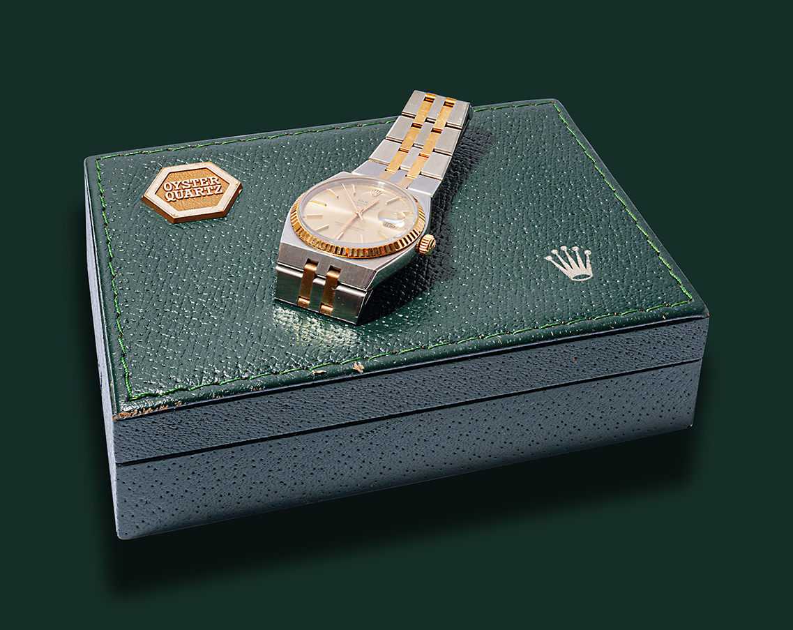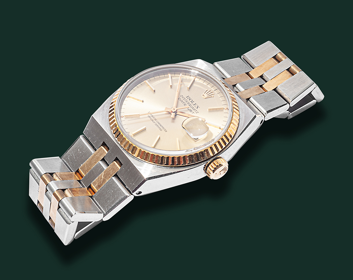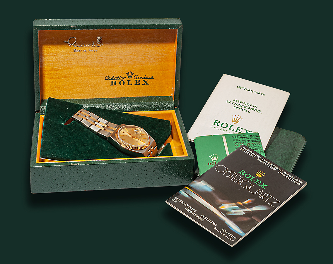 Rolex Oysterquartz, referenza 17013, anno 1982, movimento elettromeccanico al quarzo calibro Rolex 5035, cassa acciaio oro 18 Kt, bracciale jubilèe acciaio oro 18 Kt, l’orologio è stato venduto dal concessionario Ricciardi, corredato da scatola e garanzia originale Rolex, e nostra garanzia.