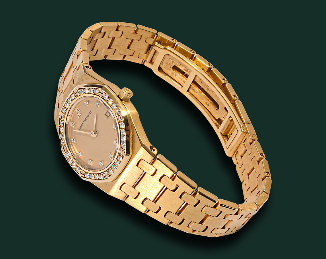 Audemars Piguet Royal Oak lady, referenza 66270BA, cassa in oro 18Kt con diametro 25mm, bracciale in oro giallo 18Kt, movimento al quarzo, vetro zaffiro, quadrante colore champagne, indici brillanti e datario a ore 3, ghiera con brillanti, orologio corredato da nostra scatola e garanzia.